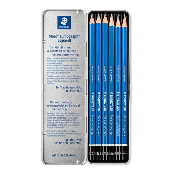 سایر توضیحات: -مداد طراحی استدلر مدل Mars Lumograph -6 عدد مداد طراحی حرفه ای بدنه آبی -شامل شماره های : HB-B2-B4-B6-B7-B8 -دارای مغزی نرم و بسیار با کیفیت -جنس جعبه :فلزی -ساخت کشور آلمان