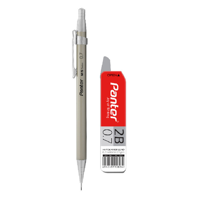 مداد نوکی پنتر مدل Metal Jacket در رنگ های زغالی، نقرهای، بژ به همراه یک بسته نوک در بسته بندی آویزدار می باشد