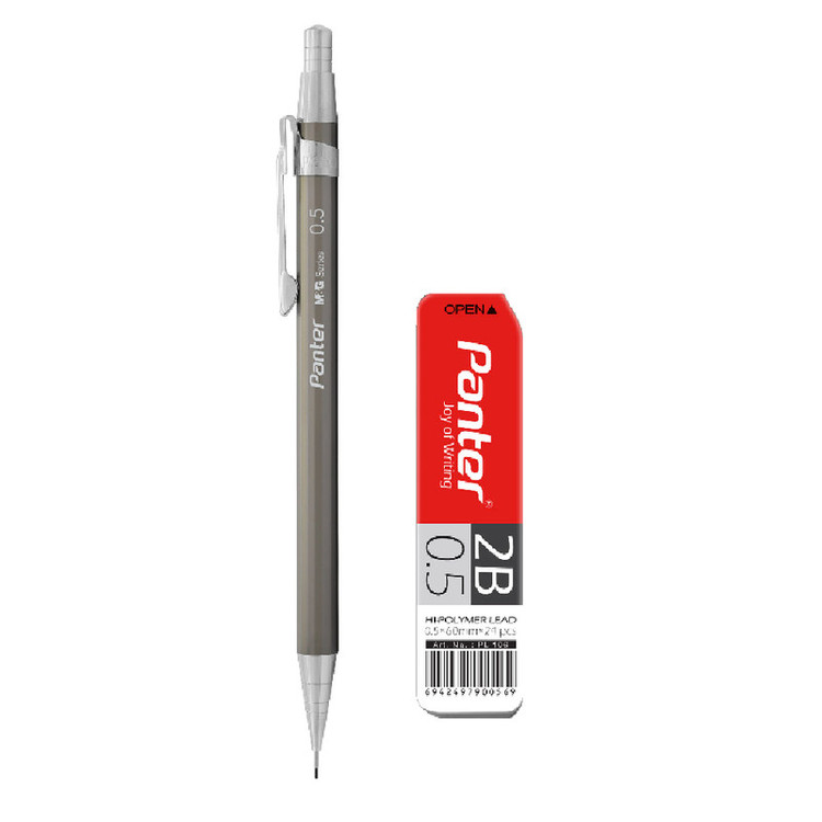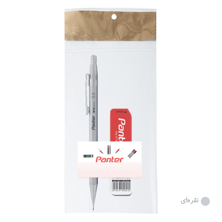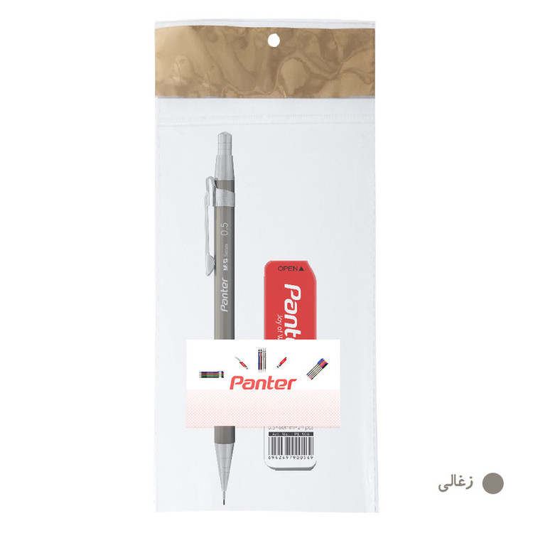 مداد نوکی پنتر مدل Metal Jacket در رنگ های زغالی، نقرهای، بژ به همراه یک بسته نوک در بسته بندی آویزدار می باشد