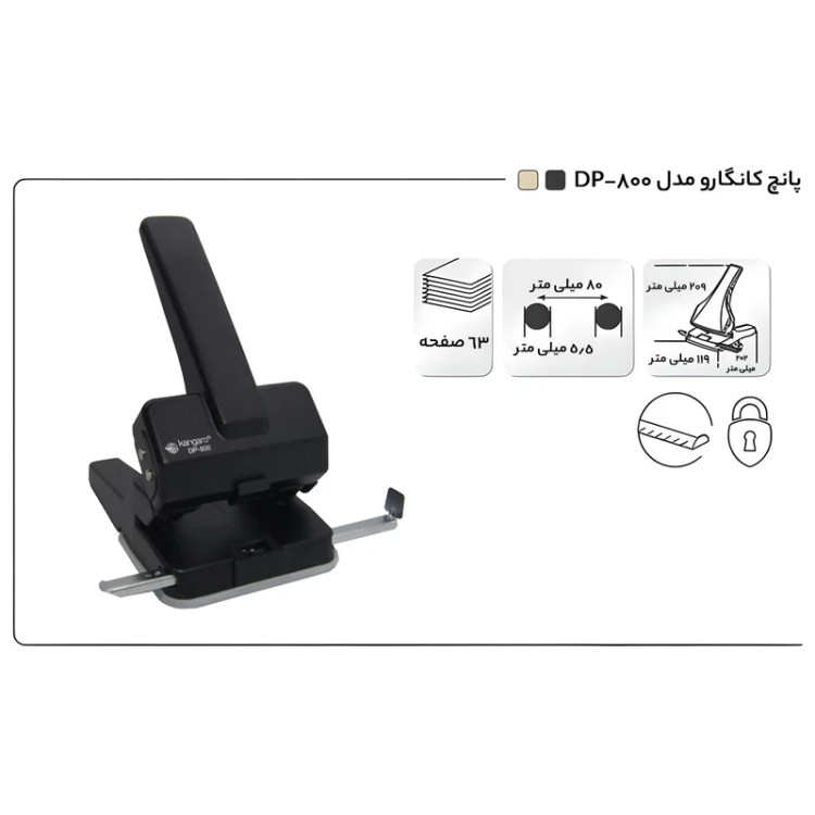 سایر توضیحات: طول ناحیه پانچ یا فاصله بین دو سوراخ پانچ ۸۰ میلی متر قابلیت سوراخ کردن ۶۰ ورق کاغذ به صورت همزمان قطر سوراخ پانچ ۶۳ میلی متر دارای زبانه فلزی تنظیم محل قرارگیری کاغذ جهت جانمایی محل سوراخ دارای سینی پلاستیکی جهت جمعآوری باقیماندههای کاغذ بدنه فلزی