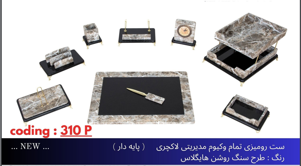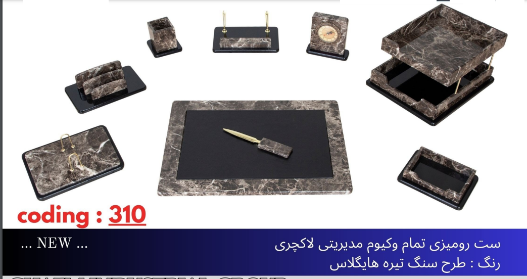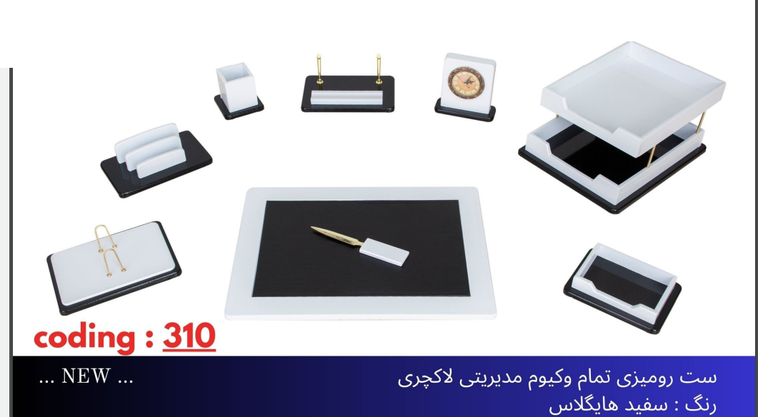 اقلام همراه: کازیه/زیردستی/استند خودکار/جا پاکتی/پاکت باز کن/جاتقویمی/جایادداشتی/جاخودکاری/ساعت رومیزی
