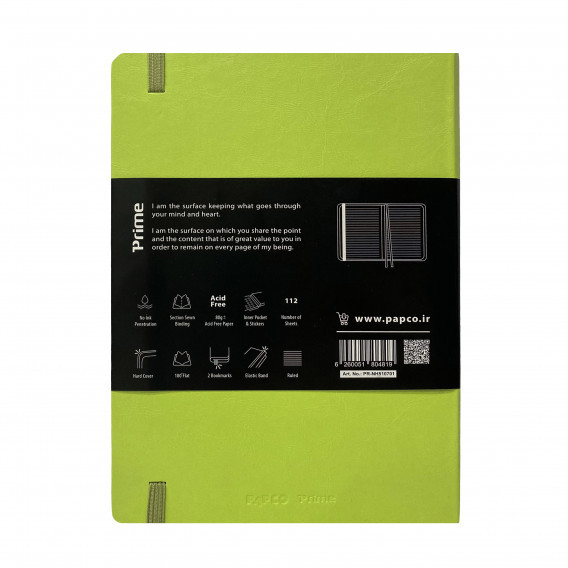 دفتر پرایم، یک خط بوده که فاصله بین خطوط آن 7 میلی متر و در واقع نزدیک به هم هستند. علاوه بر اینکه 112 برگ است، فضای زیادی برای نوشتن و در هر صفحه 27 خط دارد. در صفحه اول آن می توانید نام و اطلاعات تماس خود را برای جلوگیری از گم شدن دفتر بنویسید. در انتهای این دفتر یک جیب کاغذی نگهدارنده برای قرار دادن برگه های شما تعبیه شده است که حاوی یک برگ برچسب می باشد. جنس جلد این دفتر مقوایی و به قدری سخت و محکم است که به هیچ عنوان پاره نمی شود و تا چندین سال می توانید از آن استفاده کنید. و پس از بسته شدن با یک کش محفوظ می شود. همچنین دارای 2 ربان نشانک جهت نشان کردن صفحات مورد نظر شما است.