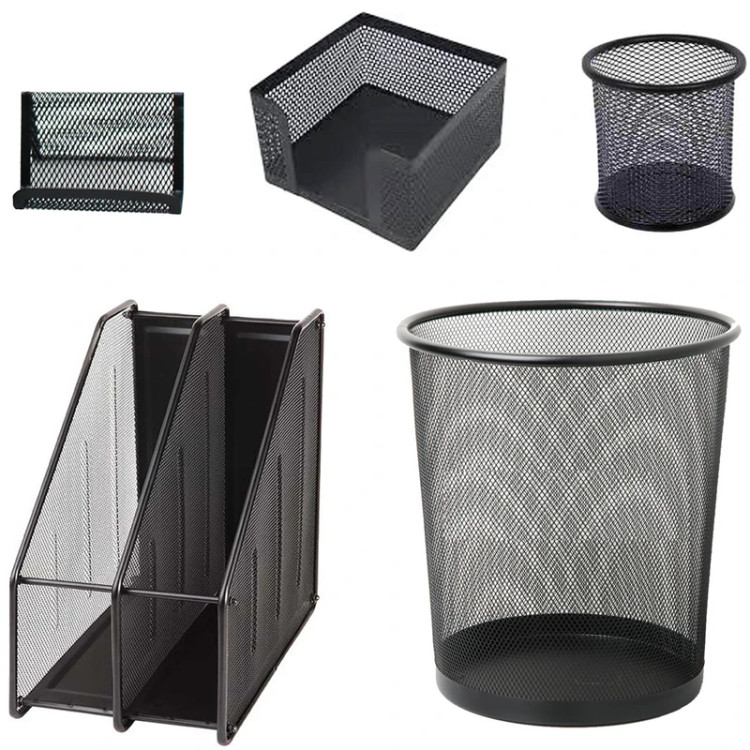 این ست شامل ۵ قلم است از جمله ۱- سطل زباله ۲- کازیه عمودی (جا کتابی ) ۳- جا قلمی رومیزی ۴- نگهدارنده کارت ویزیت یا گوشی موبایل ۵- جای کاغذ یادداشت